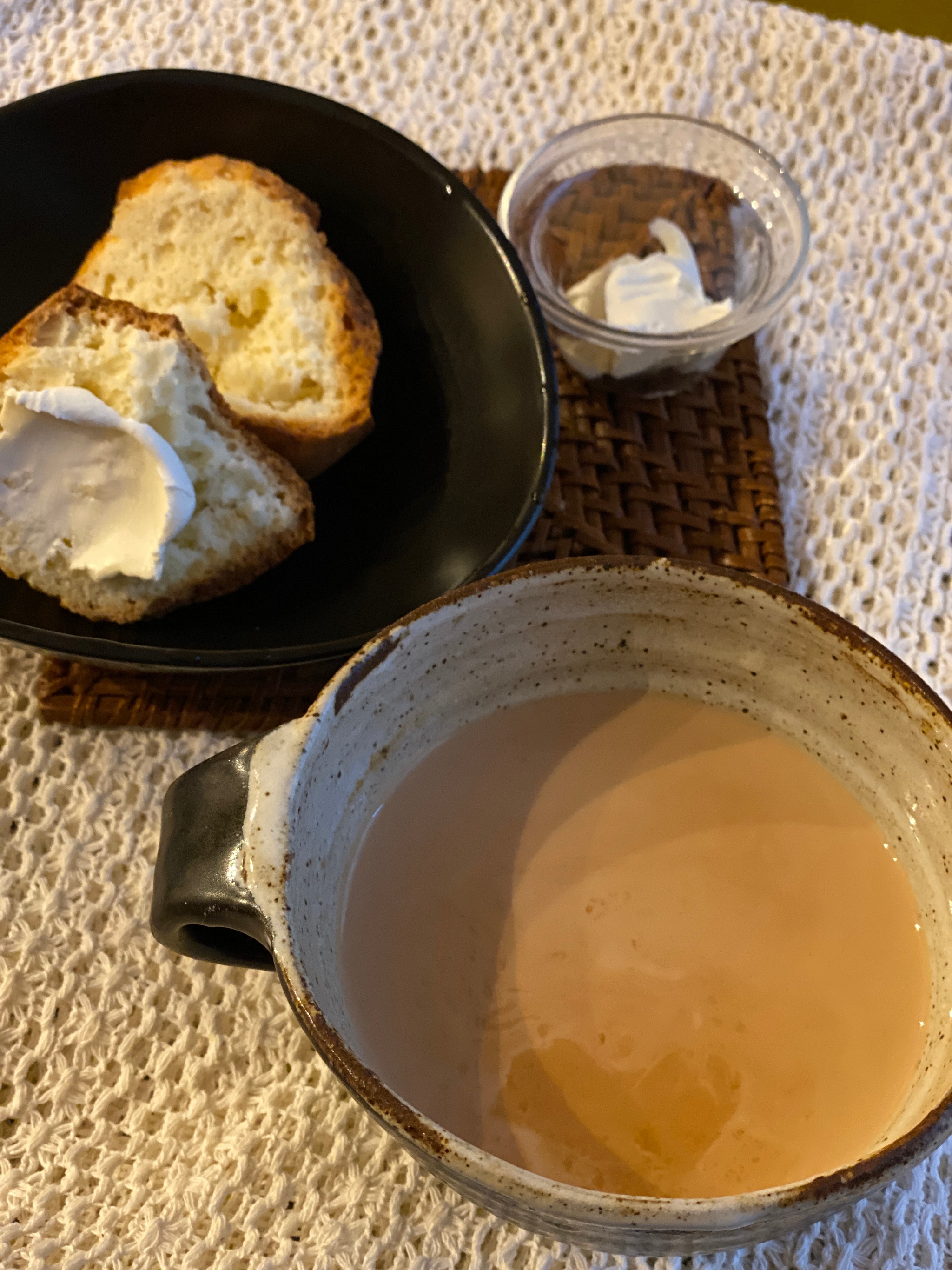 仕事やハウスワークの合間にあったかいマサラチャイとおやつ。
